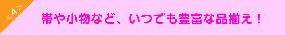 一年を通じて、袋帯や帯締め、半衿、重ね衿、草履バッグなど豊富に揃えています。