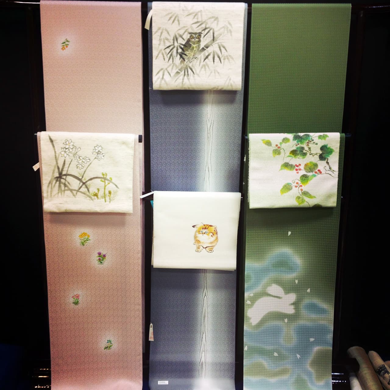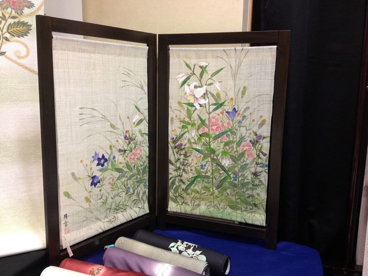 中村勝雲氏は、野や山の自然豊かな風景を切り取り、草花などをスケッチし、染色の技法を用いて図案から染めまでの工程をお一人で制作されます。