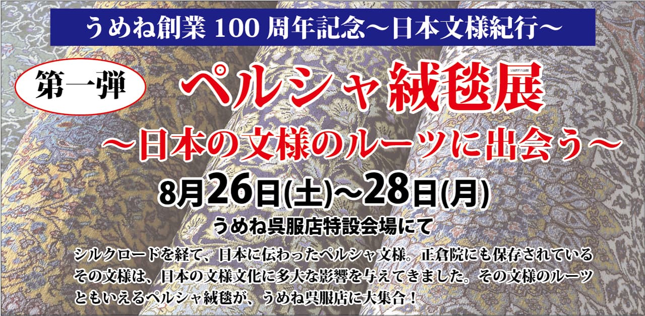 シルクロードを経て、日本に伝わったペルシャ文様。正倉院にも保存されているその文様は、日本の文様文化に多大な影響を与えてきました。その文様のルーツともいえるペルシャ絨毯が、うめね呉服店に大集合!