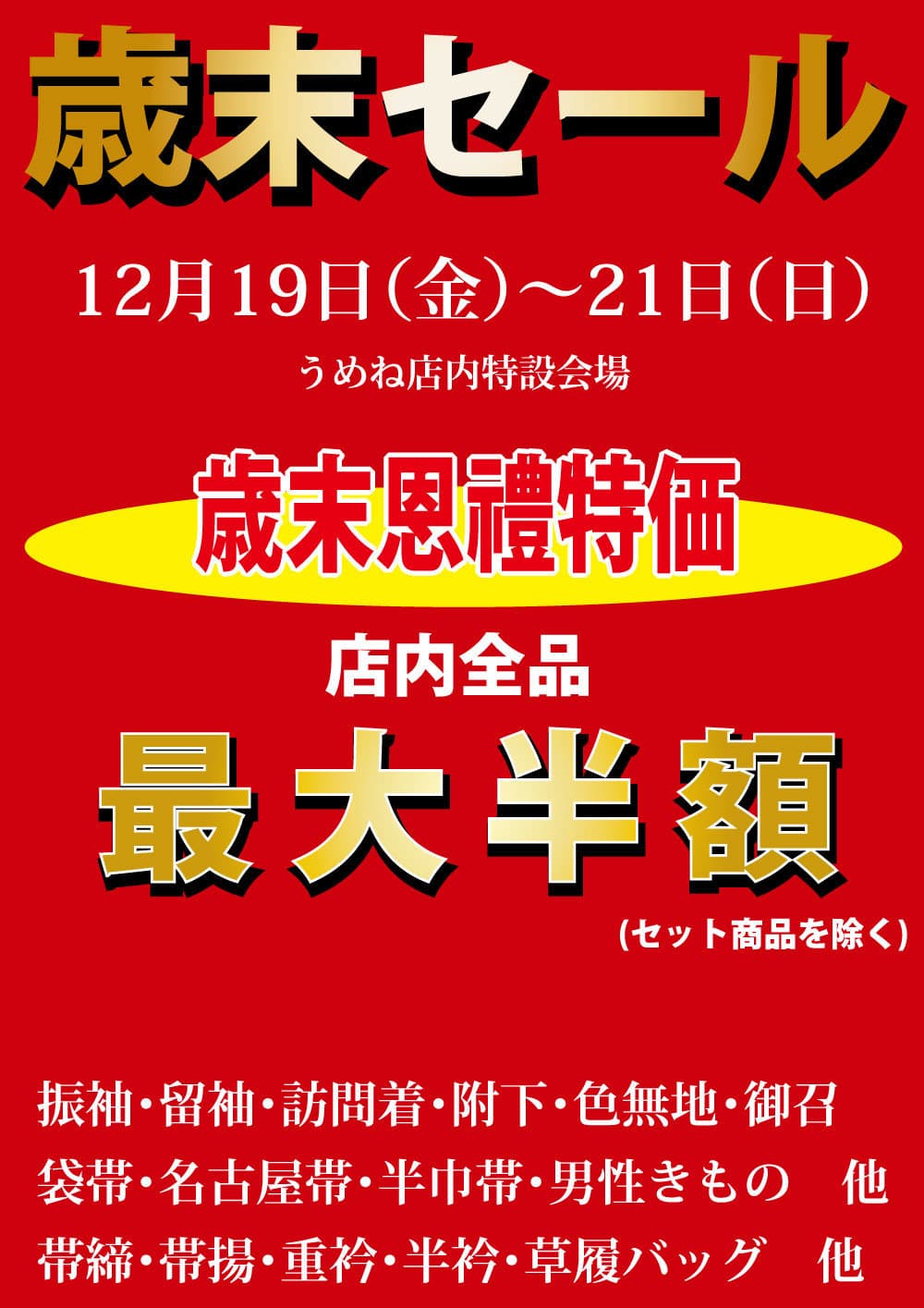 うめね呉服店2025年12月の催事・フェア・イベント 令和七年 歳末セール 終了いたしました 【日にち】令和7年12月19日(金)~21日(日)まで 【時 間】午前10時より午後6時 (最終日午後5時まで)【場 所】うめね呉服店 特設会場にて うめねの歳末セール 【同時開催】濱本拡玄 墨絵アートライブ 入学式・卒業式・お宮参りにお着物で!応援企画!! ほかにも! 振袖のご準備ご相談・きものお手入れ相談・宮参り着も多数展示! ご来場日時をご連絡いただけますと幸いです お電話または公式LINEより スマートフォンからは、クリックで電話が可能です 過去に行われた催事のアーカイブページです